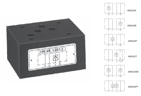 Modulární zpětný ventil typu AM5UD umožňuje průtok kapaliny pouze v jednom směru, zatímco v druhém směru průtoku brání kuželové těleso ventilu. Jedná se o neřízený zpětný ventil velikosti CETOP5. Je k dispozici v provedení s jedním ventilem pro A, B, T nebo P, ale také se dvěma ventily pro A, B, nebo P,T. Standardní provedení je s pružinou nastavenou na 1 bar. Na vyžádání je k dispozici také ventil s pružinou na 5 barů.