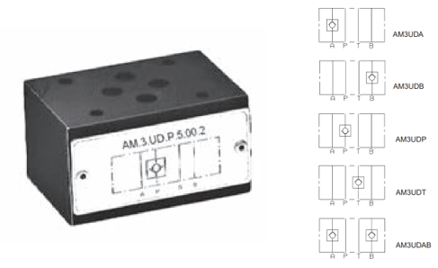 Modulární zpětný ventil typu AM3UD umožňuje průtok kapaliny pouze v jednom směru, zatímco v druhém směru průtoku brání kuželové těleso ventilu. Jedná se o neřízený zpětný ventil velikosti CETOP3. Je k dispozici v provedení s jedním ventilem pro A, B, T nebo P, ale také se dvěma ventily pro A, B. Standardní provedení je s pružinou nastavenou na 1 bar. Na vyžádání je k dispozici také ventil s pružinou na 5 barů.